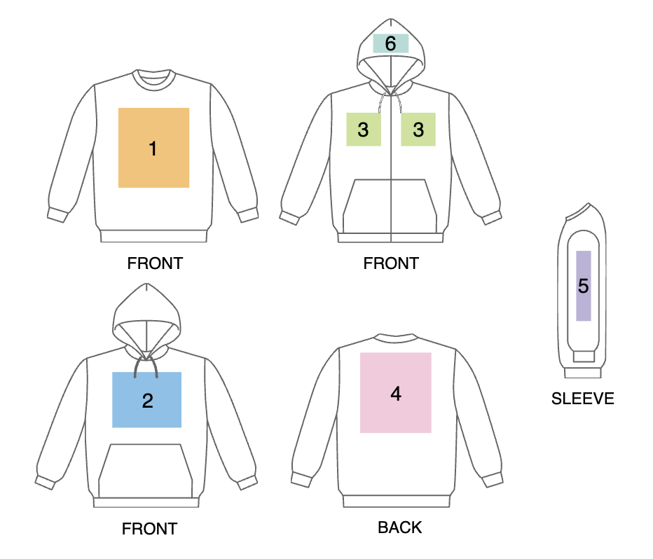 スウェットやパーカーは、前・後ろ・袖・フードと、実はプリントできる場所がとても多いウェアなんだ。図解をもとに、初心者でもイメージしやすいように、それぞれの位置をわかりやすく案内していくね。