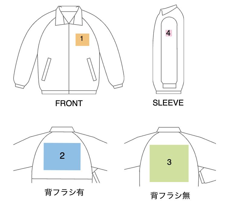 スウェット・パーカー、パンツ、ブルゾンは、アイテムごとにプリントできる位置や大きさが少しずつ異なるウェアなんだ。