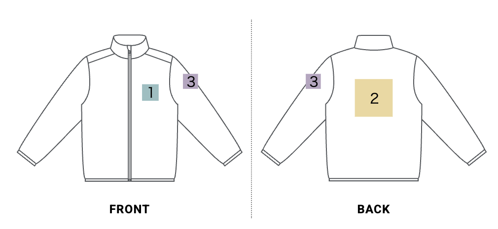 背中中央のプリントは、遠くからでも認識しやすい位置。面積が広く取れるため、大きめのロゴや文字、インパクトのあるデザインを入れやすいのが特長だよ。