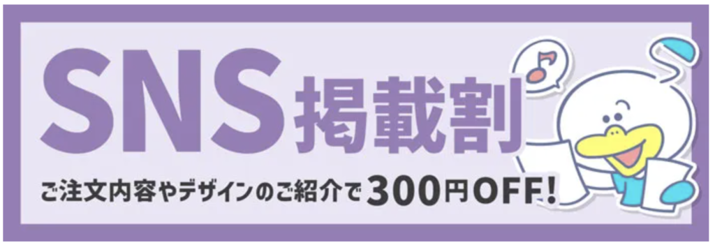 ご注文いただいた商品のデザインや注文内容を実績紹介として掲載することにご同意いただけると300円OFF