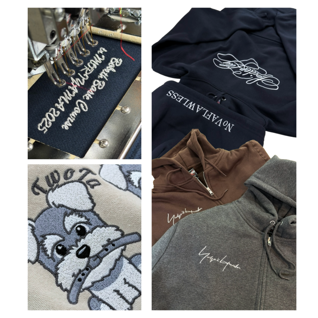 プリントだけでなく刺繍(ししゅう)加工にも対応しているよ。