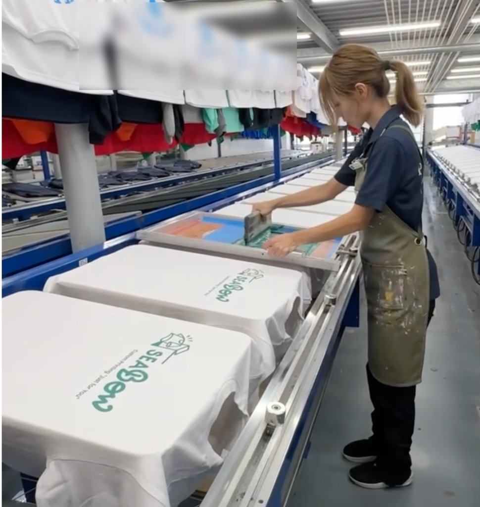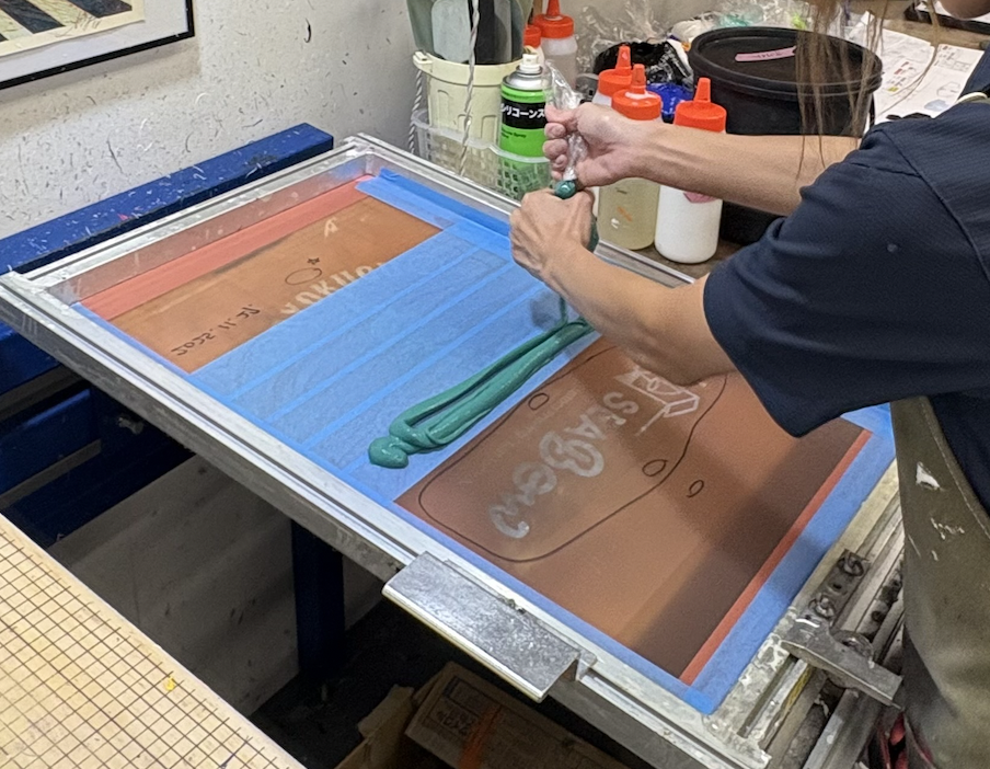 職人がスキージーを使って1枚1枚手作業で、生地に直接インクを刷っていく加工方法。